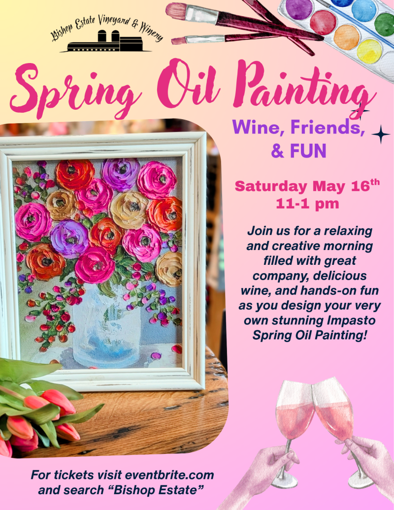 We are so excited to welcome you to another Wine, Friends, and Fun (WFF) experience at Bishop Estate Vineyard & Winery! Join us for a relaxing and creative morning filled with great company, delicious wine, and hands-on fun as you design your very own stunning Spring Oil Painting instructed by Green Frog Art.